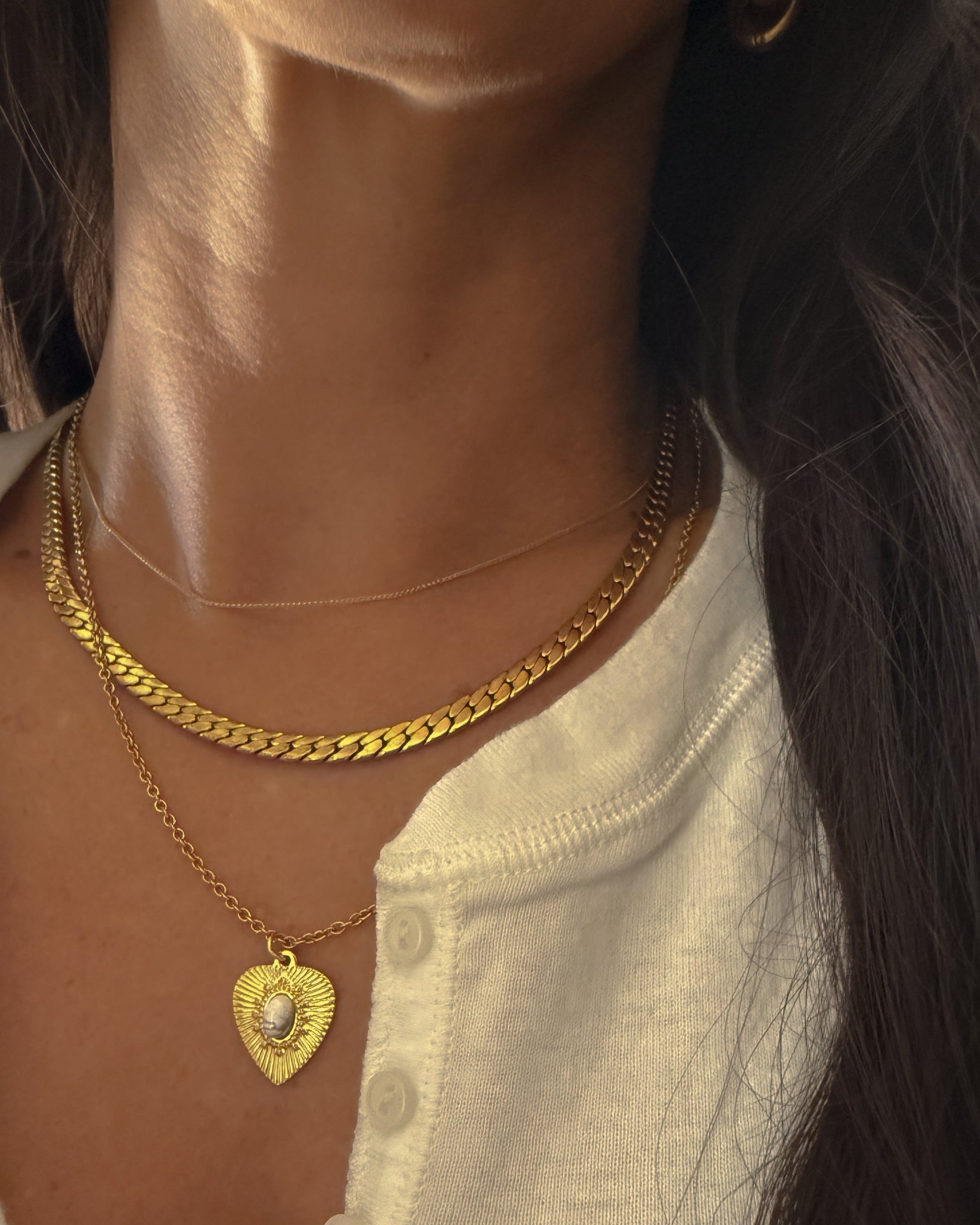 It gives a bold, polished look that lays flat against the skin — making it a perfect statement piece for layering or wearing solo. Shown stacked in the second photo