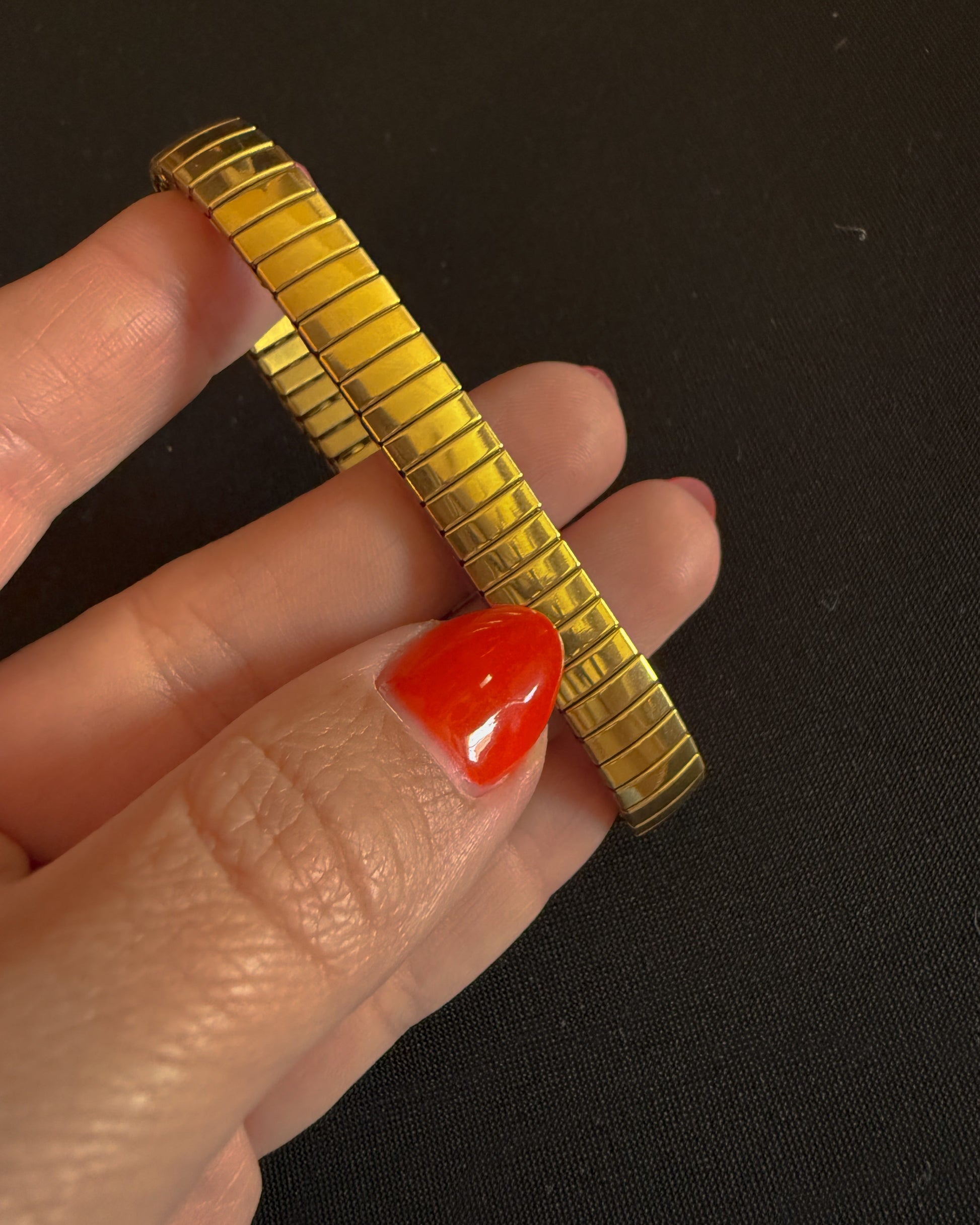 Proof that timeless doesn’t have to be boring. This curved ribbed cuff has just the right amount of shine and structure, with a stretch-on fit that makes stacking (or solo styling) a breeze. It’s low-maintenance, high-impact — just how we like it.