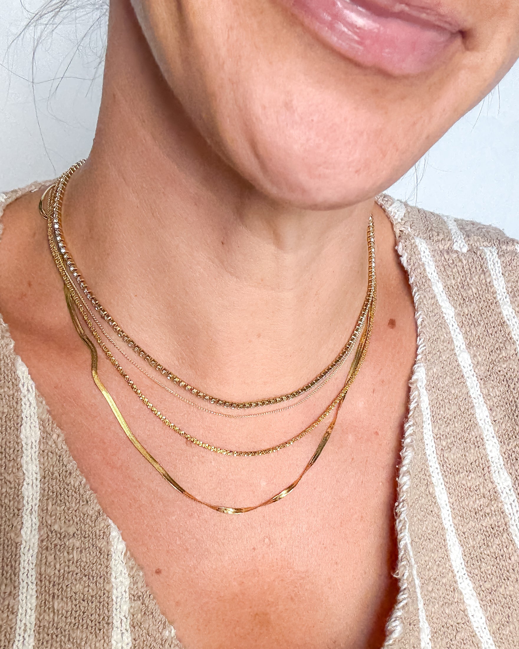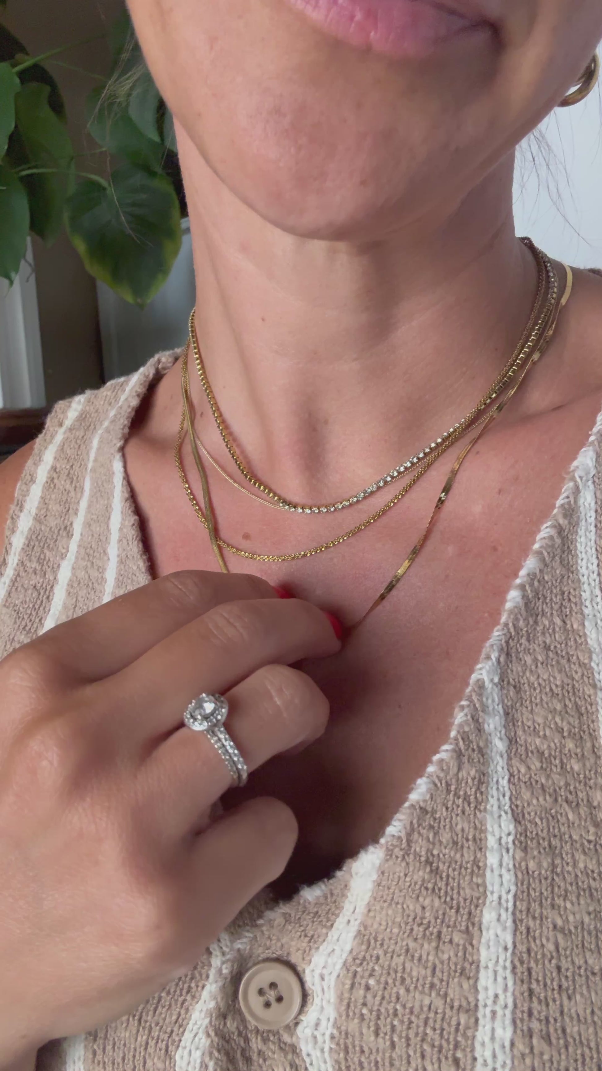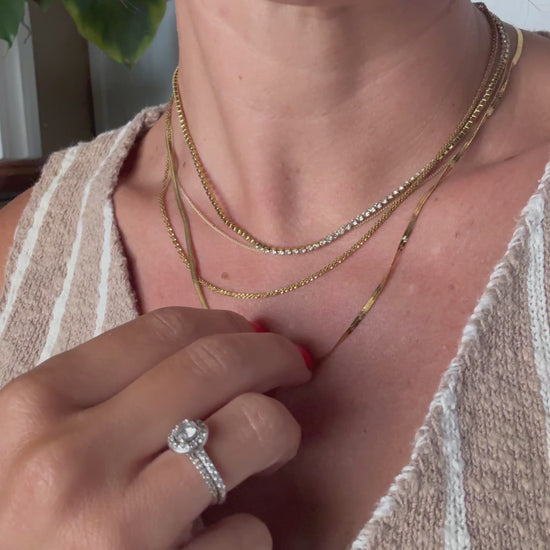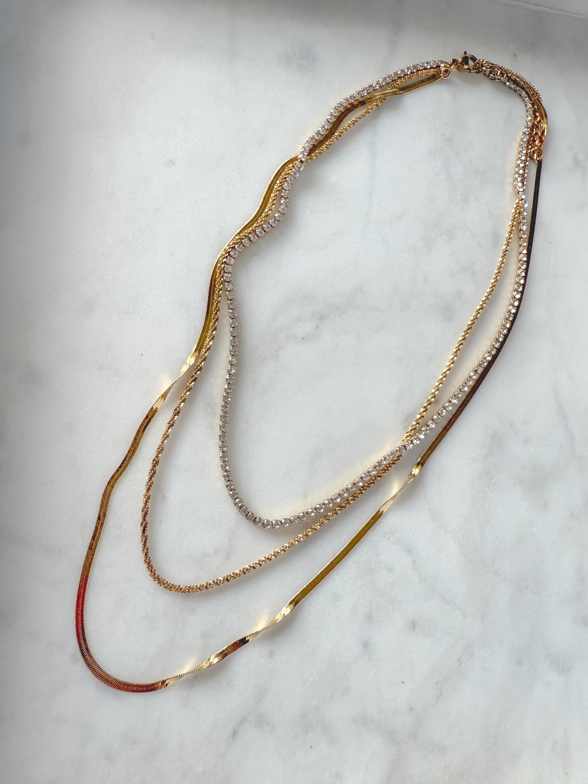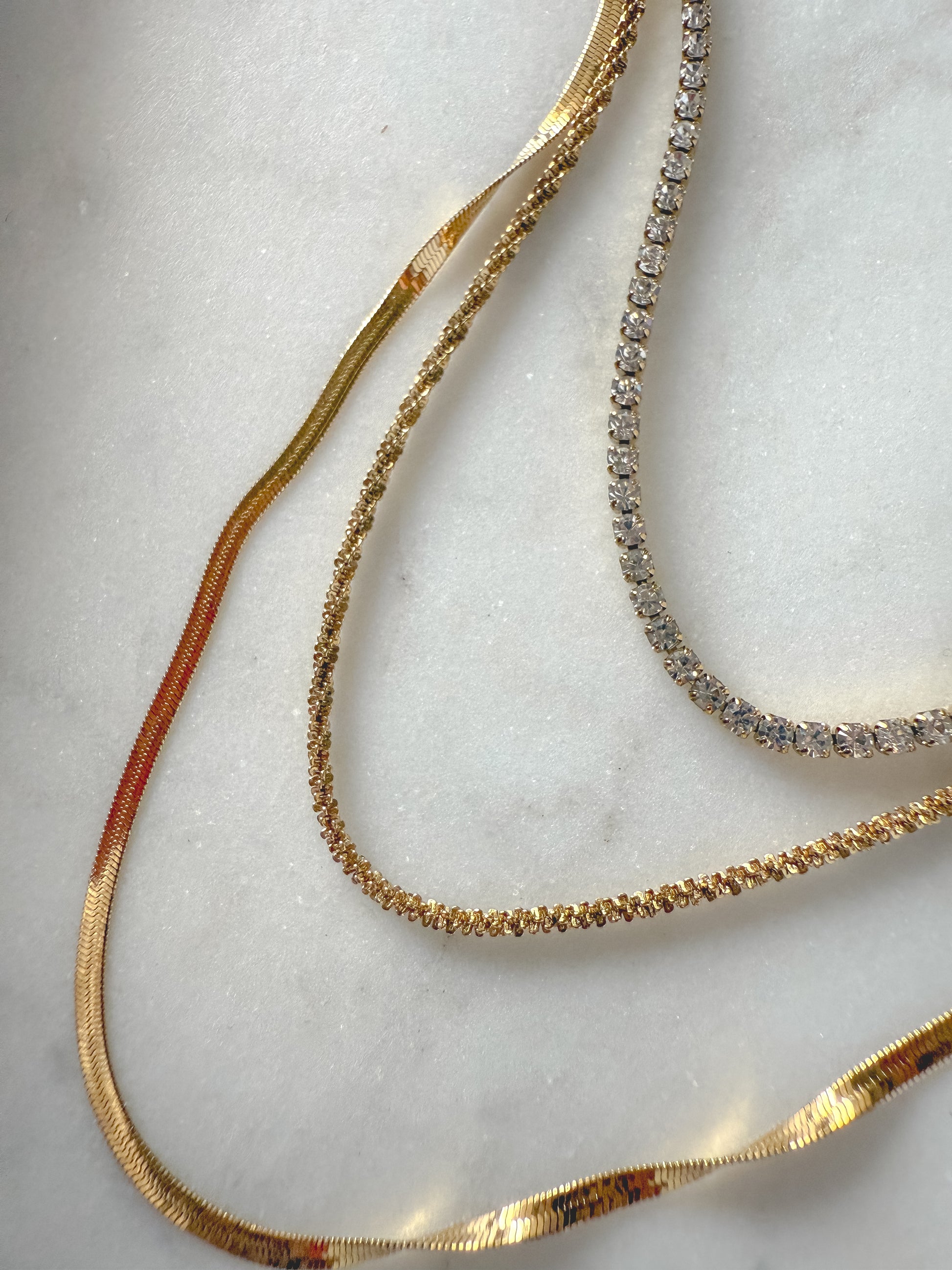 Three distinct layers move together like they were always meant to: a fluid snake chain, a textured bone detail, and a classic tennis sparkle that catches the light just right.