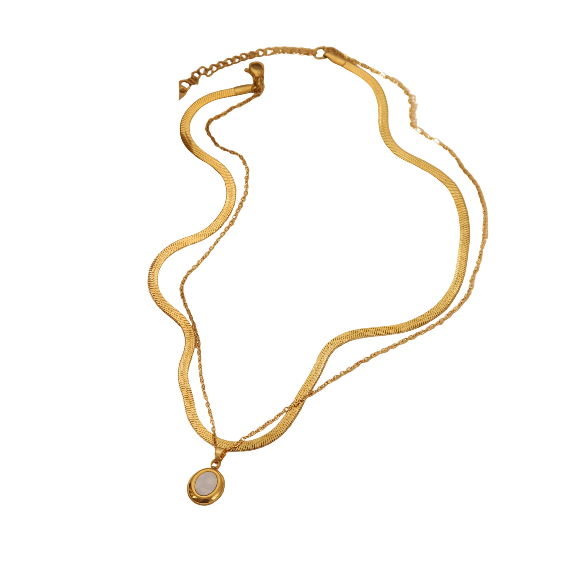 The Marseille features a pre-stacked design, combining a herringbone style chain and cable chain with an opal pendant all on one clasp. Made with stainless steel, this piece is tarnish resistant and hypoallergenic. Elevate your style with this versatile and durable accessory.